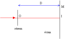 bleue : 436 nm ; verte : 546 nm ; jaune : 577 nm ; 579 nm pour l = 577 nm : sin q=577 10-9 / 6,1 10-6 =0,0946 ; tan q = 0,0946 = IM1/ 1,4 ; IM1=0,1324 m = 132,4 mm pour l = 579 nm : sin q=579 10-9 / 6,1 10-6 =0,0949 ; tan q = 0,0949 = IM1/ 1,4 ; IM2=0,1329 m = 132,9 mm La différence