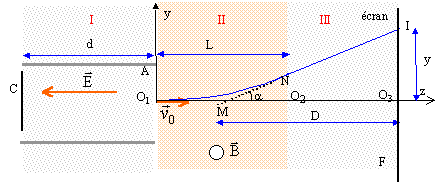 de plus tan a = O3I/D= y/D voisin de a car l'angle est petit. LeB /(mv0) = y/D ; y =LeBD /(mv0). v0 = LeBD/(my) =10-2*1,6 10-19 *2 10-3 * 0,4 / (9,1 10-31 * 0,0335)= 4,2 107 m/s. en accord avec la valeur