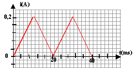 t compris entre [0 ; 10 ms] : i est une fonction linéaire de coefficient directeur 0,2 / 0,01 = 20A s-1; i(t) = 20 t. t compris entre [10 ; 20 ms] : i est une fonction affine décroissante de coefficient directeur -0,2 / 0,01 = -20A s-1; i(t) = -20 t + b ; i(t=0,01)= 0,2 =