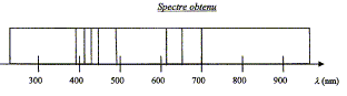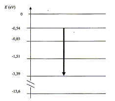 La raie correspondante est une raie d'émission d'un photon : l'atome cède de l'énergie en passant d'un état excité à un état excité de moindre énergie. Expression de l'énergie échangée |DE| entre l'atome et le milieu extérieur lors de cette transition : |DE| = h n avec n la fréquence de la radiation lumineuse. Relation entre la longueur d'onde l, de cette radiation et sa fréquence n : l = c/n. |DE| =3,39-0,54 ; |DE| = 2,85 eV. (lecture diagramme ci-dessus) puis 2,85*1,60 10-19 = 4,56 10-19 J. Valeur de la longueur d'onde l, correspondant à cette transition : |DE| = hc/l d'où l = hc/|DE| l = 6,62.10-34 *3,00.108 /4,56 10-19 =4,36 10-7 m = 436 nm. Cette raie met en évidence l'élément hydrogène. |