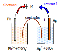 On introduit dans un bécher (1) un volume V1 =100,0 mL d'une solution de nitrate de plomb (Pb2+(aq) + 2NO3-(aq)) de concentration en soluté apporté cl = 0,100 mol/L dans laquelle plonge une lame de plomb. Dans un second bécher (2), on verse un volume V2 = 100,0 mL d'une solution de nitrate d'argent ( Ag+(aq) +NO3-(aq)) de concentration en soluté apporté c2 = 0,100 mol/L dans laquelle plonge un fil d'argent. On dispose également d'un pont salin. On admet que la transformation chimique permettant à cette pile de fonctionner est décrite par la réaction: 2 Ag+(aq) + Pb(s) = 2 Ag(s)+Pb2+(aq). La constante d'équilibre associée à cette réaction est K = 6,8 1028.