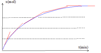 La réaction entre un acide carboxylique et un alcool est une estérification ; cette réaction est lente. (a) et (e) sont donc vraies. Evolution de la vitesse de la réaction étudiée : Expression de la vitesse v = 1/V dx/dt avec V: volume en (L) et x : avancement en mol. dx/dt représente le coefficient directeur de la tangente à la courbe x=f(t) à une date donnée. Or on peut constaté que les tangentes sont de moins en moins inclinées sur l'horizontale au cours du temps : leur coefficient directeur diminue donc. La vitesse étant proportionnelle à ce coefficient, la vitesse diminue au cours du temps.