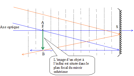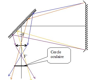 former dans le plan focal objet de l'oculaire. 1/f' = 1/OA'-1/OA. ( O : centre optique de l'oculaire, A : objet , A' : image de A donnée par l'oculaire) si OA= - f' alors 1/OA'= 0 et OA' tend vers l'infini. Le cercle oculaire : c'est l'image de l'objectif ( ici miroir convergent + miroir plan), donnée par l'oculaire.