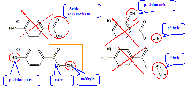 Les cosmétiques sont des produits d'hygiène et d'embellissement du corps humain. Ils sont de plus en plus nombreux dans nos salles de bain. On classe dans les cosmétiques, les produits de soin, de maquillage, de rasage, des produits capillaires, solaires, des parfums... Un cosmétique contient plusieurs ingrédients dont un ou plusieurs principes actifs, un excipient et des additifs. L'emballage d'un produit cosmétique doit comporter la liste complète des ingédients. Dans cet exercice on se propose d'étudier quelques composants des produits cosmétiques. Les parabènes : Les parabènes ( paraben en anglais) sont des conservateurs utilisés dans l'industrie cosmétique pour empécher la prolifération des bactéris et des champignons. On les trouve dans bon nombre de produits de beauté : shampoings, gels douches, crèmeshydratantes....Les parabènes les plus courants sont : le méthylparaben, l'éthylparaben, le propylparaben et le buthylparaben. La formule semi-développée du propylparaben ou parahydroxybenzoate de propyle est :