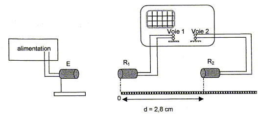 Partie A : Au cours d'une séance de travaux pratiques, un élève dispose du matériel suivant : un émetteur d'ultrasons E et son alimentation électrique ; deux récepteurs d'ultrasons R1 et R2 ; un oscilloscope ; une règle graduée. Il réalise le montage suivant :
