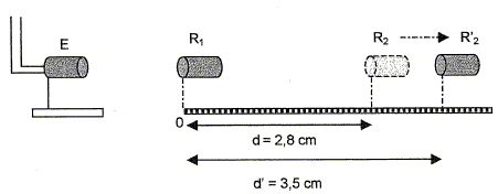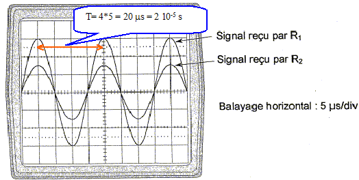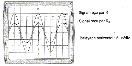 L'émetteur E génère une onde ultrasonore progressive dans l'air jusqu'au récepteurs R1 et R2. L'émetteur et les récepteurs sont alignés. Le récepteur R1 est placé au zéro de la règle graduée. Les signaux captés par les récepteurs R1 et R2 sont appliqués respectivement sur les voies 1 et 2 d'un oscilloscope pour être visualisés sur l'écran de celui-ci. Lorsque le récepteur R2 est situé à la distance d = 2,8 cm du récepteur R1, les signaux reçus par les deux récepteurs sont en phase. On observe l'oscillogramme ci-dessous :