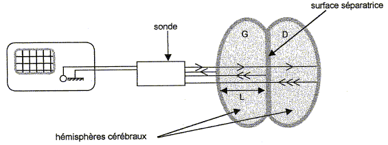 Dt = 160-10 = 150 ms. La durée séparant le pic P3 du pic P2 correspond à la durée de l'aller et du retour de l'onde ultrasonore dans l'hémisphère droit : Dt = 310-160 = 150 ms. Largeur de chaque hémisphère : Ces largeurs sont identiques car Dt est le même. largeur (m)= célérité (m/s)* durée Dt (s) / 2 =1500 * 150 10-6 / 2 largeur = 15 102 * 15 10-5 / 2 =225 / 2 10-3 = 113 10-3 = 1,13 10-1 m. |