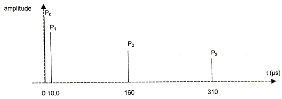 P0 correspond à l'émission à l'instant de date t=0 s de l'impulsion ; P1 à l'écho du à la réflexion sur la surface externe de l'hémisphère gauche ( G sur le schéma) ; P2 à l'écho sur la surface de séparation des deux hémisphères ; P3 à l'écho sur la surface interne de l'hémisphère droit ( D sur le schéma). La célérité des ultrasons dans les hémisphères est v = 1500 m/s.