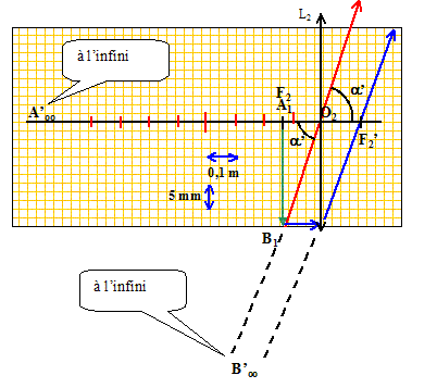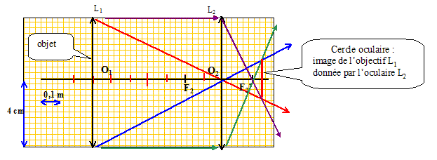 On écrit en bleu et en gras les distances algébriques. Position de l'image intermédiaire A1B1 : Ecrire la formule de conjugaison pour la lentille L1 : 1/O1F'1 = 1/O1A1-1/O1A. avec O1F'1 = 0,10 m ; O1A = -0,125 m 1/O1A1=1/O1F'1 +1/O1A = 1/0,100 + 1/(-0,125) = 10-8 = 2 O1A1=1/2 =0,500 m. Avec quel point particulier de la lentille L2, le point A1 est-il confondu ? O1F'1 +F'1F2=0,10 +0,40 =0,50 m A1 est donc confondu avec le foyer principal objet F2 de la lentille L2. Grandissement théorique g1 de l'objectif : g1 = O1A1/ O1A =0,500 / (-0,125) ; g1 = -4,00. Hauteur de l'image A1B1 : g1 = A1B1 / AB = -4 ; A1B1 = - 4 AB = -4,00*0,500 = -2,00 cm. L'image est 4 fois plus grande que l'objet : hauteur de l'image 2,00 cm. Le grandissement étant négatif, l'image A1B1 et l'objet AB sont de sens contraire.