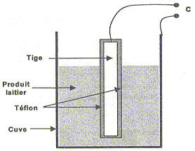 Tous les composants sont considérés comme parfaits : - Les circuits intégrés logiques sont alimentés sous la tension VDD = 12 V. Ils ont une impédance d'entrée infinie et une impédance de sortie nulle. Leur tension de sortie peut être égale à 0 V ou à 12 V. - Les amplificateurs opérationnels (ou AO) sont alimentés sous les tensions +VCC = +12 V et -VCC = -12 V. Ils ont une impédance d'entrée infinie et une impédance de sortie nulle. Leurs tensions de saturation sont égales à -12 V ou à +12 V. - Les diodes sont supposées idéales. Etude de la sonde capacitive : La sonde capacitive est assimilable à un condensateur cylindrique. Une tige métallique cylindrique plongée au centre de la cuve forme la première armature du condensateur ( figure ci-dessous). Cette tige est recouverte d'une mince couche d'isolant (téflon). La cuve, également métallique et cylindrique, joue le rôle de deuxième armature. Le condensateur ainsi formé possède une capacité C qui dépend du niveau de produit laitier.