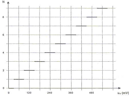 Pour une tension u4 de 4,5 V, le nombre N correspondant : N= u4/q = 4,5 / 0,06 ; N= 75. L'afficheur indique h = 0,75 m.