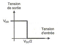 La tension u4 issue de l'amplificateur est également appliquée à l'entrée d'un comparateur à 2 seuils réalisé à partir de portes logiques inverseuses. La caractéristique de transfert d'une porte logique inverseuse est donnée ci-dessous.