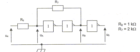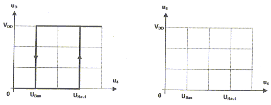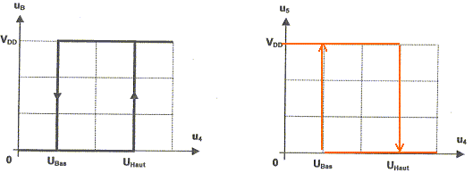 Une tension d'entrée uA = ½VDD provoque le basculement des sorties des portes logiques. Expression de la tension uA en fonction de R6, R7, u4 et uB. L'impédance d'entrée des portes logiques étant infinie, l'intensité des courants d'entrée est nulle. On note i l'intensité traversant R6 et R7. L'additivité des tensions permet d'écrire : u4 = R6 i + uA ; i = (u4- uA ) / R6 uA = R7 i + uB =(u4- uA ) R7 / R6+ uB (uA -uB)R6 / R7= u4- uA uA[1+R6 / R7] = u4+ uBR6 / R7 ; uA[ R7+R6 ] = R7 u4+ uBR6 uA =( R7 u4+ uBR6) / ( R7+R6 ). Expression de u4 en fonction de R6, R7, uA et uB. u4=[ ( R7+R6 )uA - uBR6) ] / R7 Sachant que uB peut prendre les valeurs 0 et VDD, expressions des tensions de seuils UHaut (seuil haut) et UBas (seuil bas) du comparateur en fonction de R6, R7 et VDD. Si uB = 0 : u4=( R7+R6 )/ R7 uA ; Or uA = ½VDD. u4=½( 1+R6 / R7) VDD = Uhaut. Si uB = VDD : u4=( R7+R6 )/ R7 uA - VDDR6/ R7 ; Or uA = ½VDD. u4= ½VDD (1- R6 / R7 )= Ubas. Valeurs numériques de UHaut et UBas. R6 / R7 = 0,5 ; VDD = 12 V. Uhaut = 9 V ; Ubas = 3 V. Caractéristique de transfert du comparateur u5 = f(u4) sur le même document en fléchant le sens de parcours du cycle. La dernière porte logique inverse la tension uB : Si uB=0 : u5= VDD ; Si uB= VDD : u5= 0.