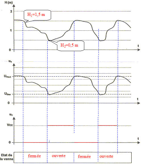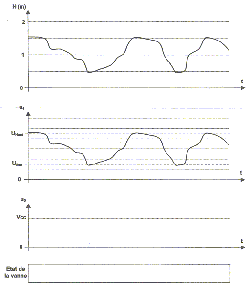 Cette synthèse vise à reprendre les résultats des différentes parties étudiées précédemment de façon à comprendre le fonctionnement global du système. - L'évolution du niveau H de produit laitier dans le bac de conditionnement est représentée sur le document ci-dessous ainsi que la tension u4 appliquée à l'entrée du comparateur. Représenter la tension de sortie du comparateur u5 en concordance de temps avec u4. - Compléter le bandeau "État de la vanne" par les mentions "Ouverte" ou "Fermée" en correspondance avec la tension u5. - À l'aide d'une lecture graphique, déduire le niveau H1 de produit laitier qui déclenche l'ouverture de la vanne et le niveau H2 qui provoque la fermeture de la vanne.