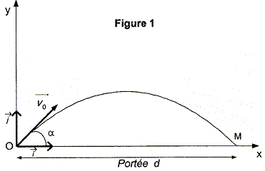 La galiote était un navire de guerre qui fit son apparition à la fin du XVIIème siècle, sous le règne de Louis XIV. Les galiotes possédaient de lourds canons, fixés au pont, projetant des boulets de 200 livres (environ 100 kg) portant jusqu'à 1200 toises (environ 2400 m). Selon la description détaillée de Renau, Inspecteur Général de la Marine, ces bâtiments sont destinés à emporter des canons en mer. Ils sont de moyenne grandeur et à fond plat. De par leur fabrication, l'angle de tir des canons est fixe et a pour valeur a = 45°, ce qui permet de tirer à la plus grande distance possible. La structure d'une galiote doit être très robuste pour résister à la réaction considérable du boulet et leur échantillon* est ordinairement aussi fort que celui d'un vaisseau de 50 canons. * dimension et épaisseur des pièces utilisées pour la construction. D'après le site Internet de l'Institut de Stratégie Comparée. Les parties 1, 2 et 3 de cet exercice sont indépendantes. Certaines aides au calcul peuvent comporter des résultats ne correspondant pas au calcul à effectuer. Action de la poudre de canon sur le boulet : L'éjection du boulet est provoquée par la combustion de la poudre. Une force de poussée est donc exercée sur le boulet par l'ensemble {galiote + canon + gaz}. Justifier l'expression soulignée dans le texte ci-dessus, à l'aide d'une des trois lois de Newton. Enoncer cette loi. (On pourra s'aider d'un schéma). La trajectoire du boulet : On souhaite étudier la trajectoire du centre d'inertie G du boulet de masse m. L'étude est faite dans le référentiel terrestre considéré comme galiléen. Le repère d'étude est (O,i , j ) et l'origine des dates est choisie à l'instant où le boulet part du point O.