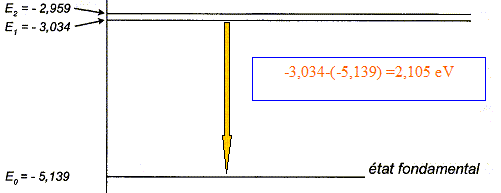 On note E l'énergie du photon émis lors d'une transition énergétique d'un atome. Expression littérale de E en fonction de la longueur d'onde l de la radiation lumineuse émise dans le vide, de la constante de Planck h et de la célérité de la lumière dans le vide c. E= hc/ l. Valeur de E en électronvolts, pour le rayonnement correspondant à la raie D du sodium : E = 6,626 10-34* 2,998 108 / (589,0 10-9 )= [6,626 *2,998 / 589]* 10-17 J Diviser par 1,602 10-19 pour obtenir l'énergie en eV : E = [6,626 *2,998 / (1,602*589]* 102 ; E= 2,105 eV. Transition correspondant à cette émission :