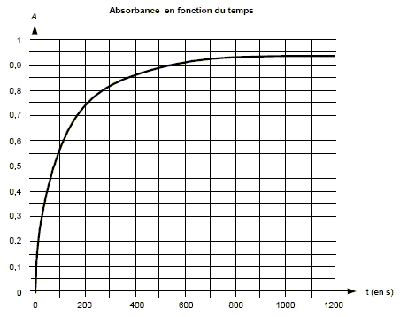 On désire étudier l'évolution temporelle de la réaction d'oxydation des ions iodure par le peroxyde d'hydrogène (H2O2) par suivi spectrophotométrique. L'équation de la réaction modélisant la transformation étudiée est : H2O2 (aq) + 2I-(aq) + 2H3O+ = I2(aq) + 4H2O(l) On dispose des solutions suivantes : SA : solution d'acide sulfurique dont la concentration en ions oxonium est cA = 0,10 mol/L SB : solution d'iodure de potassium dont la concentration en ions iodure est cB = 0,10 mol/L SC : solution de peroxyde d'hydrogène dont la concentration est cC = 0,10 mol/L. Lors des expériences décrites ci-dessous, la seule réaction chimique faisant intervenir les ions iodure est celle écrite ci-dessus. Première expérience : Á l'aide d'une solution témoin, on règle le spectrophotomètre à une longueur d'onde adaptée pour l'étude de l'absorption par le diiode. Seul le diiode absorbe à cette longueur d'onde. On rappelle que d'après la loi de Beer-Lambert, l'absorbance A est proportionnelle à la concentration de l'espèce absorbante. On mélange VA = 30,0 mL de la solution SA avec VB = 60,0 mL de la solution SB. À l'instant de date t = 0 s, on déclenche le chronomètre et on ajoute VC = 10,0 mL de solution SC. Rapidement on homogénéise et on verse quelques millilitres du mélange dans une cuve qu'on place dans le spectrophotomètre. On obtient la courbe suivante.