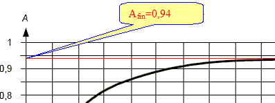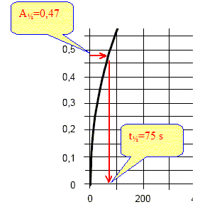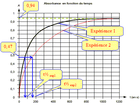 La vitesse est proportionnelle à dA/dt ; dA/dt représente le coefficient directeur de la tangente à la courbe à la date considérée. La vitesse à t2=800 s est bien plus faible qu'à la date t1 = 200 s. Le temps de demi-réaction : Le temps de demi réaction t½ est le temps au bout duquel l'avancement est égal à la moitié de l'avancement final. Or l'avancement et l'absorbance sont proportionnel donc At½ =½ Afin = 0,94 / 2 = 0,47.