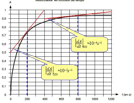 r = xf/Af = 1,0 10-3 / 0,94 = 1,1 10-3 mol. Expression de la vitesse de réaction v en fonction du rapport r, du volume V et de la dérivée de l'absorbance par rapport au temps dA/dt : v =1/V dx/dt ; d'autre part : x= r A avec r une constante : dx/dt = r dA/dt. v = r/V dA/dt. Comparaison des vitesses volumiques de la réaction aux instants t1 = 200 s et t2 = 800 s :
