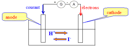 Gay-Lussac étudia les propriétés de l'élément iode et constata de nombreuses analogies avec l'élément chlore. En particulier il synthétisa un gaz, l'iodure d'hydrogène (HI ) dont les propriétés sont très proches de celles du chlorure d'hydrogène. Dans un laboratoire, on a fabriqué un litre d'une solution S1 en dissolvant une quantité de matière n1 = 5,0 10-2 mol d'iodure d'hydrogène dans l'eau. L'iodure d'hydrogène réagit totalement avec l'eau et on obtient une solution qui contient des ions iodure et des ions oxonium. Les concentrations molaires volumiques des ions iodure et oxonium dans la solution ainsi fabriquée sont [H3O+(aq)] = [I-(aq)] = 5,0 10-2 mol/L. On utilise la solution S1 pour faire une électrolyse. Dans un becher on verse 100,0 mL de solution S1, puis on plonge deux électrodes inattaquables reliées à un générateur de tension constante. Données : Couples oxydant / réducteur : I2(aq) / I- (aq) ; O2(g) / H2O(l) ; H+(aq)/H2(g) Volume molaire des gaz dans les conditions de l'expérience : VM = 25 L.mol-1. Quantité d'électricité transportée par une mole d'électrons : F = 9,65 104 C.mol-1.
