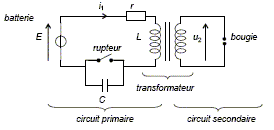 E = 12 V, tension aux bornes de la batterie, considérée comme un générateur idéal de tension. La bobine du circuit primaire est modélisée par une inductance pure L en série avec une résistance r = 6,0 W. Le rupteur est un interrupteur commandé par le mouvement mécanique du moteur. Le rôle du transformateur est d'obtenir une tension de sortie u2 aux bornes de la bougie très élevée. Les propriétés du transformateur sont telles que les grandeurs u2 et i1 sont liées par la relation : u2 = a di1/dt , où i1 est l'intensité du courant dans le circuit primaire et a une constante indépendante du temps, positive. Aucune autre connaissance concernant le fonctionnement du transformateur n'est nécessaire pour résoudre l'exercice. L'objectif de l'exercice est de montrer que des étincelles se produisent aux bornes de la bougie lorsque le rupteur est ouvert. Étude du circuit primaire sans condensateur : Rupteur fermé : le circuit primaire peut être alors modélisé selon le schéma -Que devient cette équation différentielle en régime permanent ? - En déduire la valeur de l'intensité I1 du courant dans le circuit primaire en régime permanent. - Peut-il y avoir une étincelle aux bornes de la bougie en régime permanent ? Justifier.