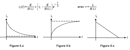 Réponse : Effet de la bobine sur la rupture du courant : La bobine s'oppose à la disparition du courant dans le circuit : elle introduit un retard à l'annulation du courant. Allure de l'évolution de l'intensité i1 du courant en fonction du temps : i1 est de la forme i1=A + B exp (-at) avec A, B et a des constantes positives. B exp (-at) est une exponentielle décroissante qui tend vers zéro au bout d'un temps suffisamment long : i1 tend alors vers une valeur constante non nulle. d'où le choix de la figure 6 a. valeur de la constante de temps t :