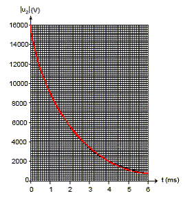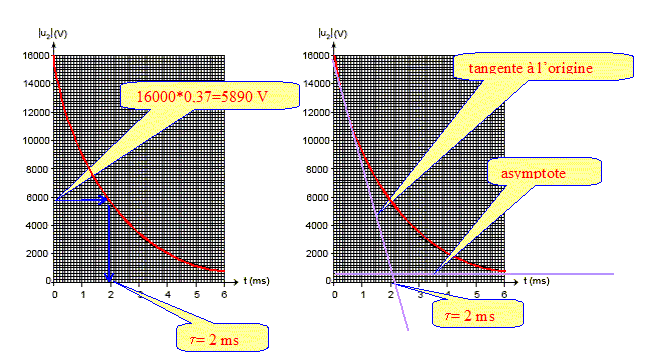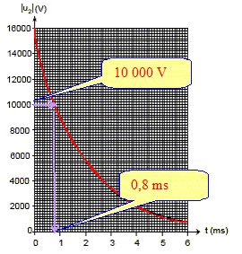 A partir de cette courbe, déterminer la valeur de la constante de temps t . A partir de quelle date peut-on considérer qu'il n'y a plus d'étincelle aux bornes de la bougie ?