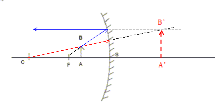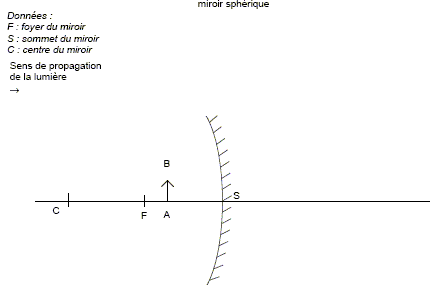 L'image est plus grande que l'objet : M1 est le miroir sphérique. Un écran entier, placé entre l'objet et le miroir sphérique, arrêterait tout le faisceau lumineux incident. Il n'y aurait pas réflexion de ce faiseau sur le miroir sphérique et en conséquence pas d'image. Distance focale du miroir sphérique : Le miroir sphérique est placé à plusieurs mètres de l'objet : l'objet peut être considéré à l'infini. Dans ce cas l'image se forme au foyer du miroir sphérique. La distance entre l'écran et le miroir est égale à la distance focale soit 90 cm.