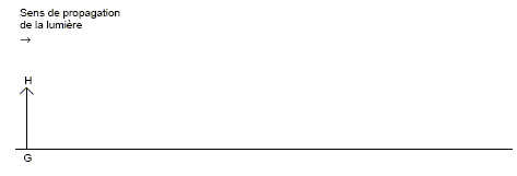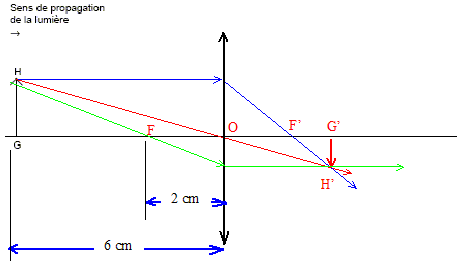 Clémentine utilise à nouveau le dispositif de la question précédente pour déterminer cette fois la distance focale de la lentille L. Elle remplace donc le miroir sphérique par cette lentille de centre O et de diamètre 5,0 cm. Elle pose cette lentille 6,0 cm à droite de la flèche lumineuse GH (de 2,0 cm de hauteur) qui sert d'objet. Elle obtient une image nette G'H' en plaçant l'écran 3,0 cm à droite de la lentille. Placer, à l'échelle, sur la figure ci-dessous, la lentille L et l'écran afin d'illustrer l'expérience de Clémentine. En déduire par construction, à l'échelle, sur la figure, la position des foyers F et F' de la lentille L.
