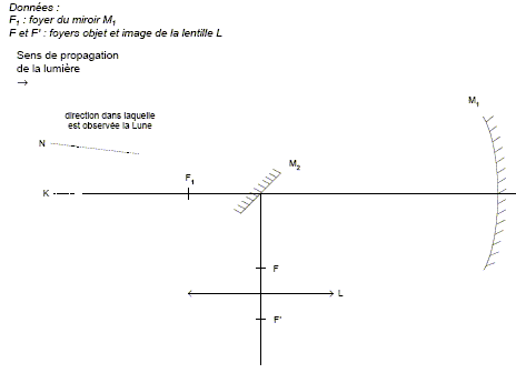 En feuilletant un magazine scientifique, Clémentine, passionnée d'astronomie, lit la petite annonce suivante : " À VENDRE, télescope de Newton, état neuf, pas de notice ". Bien décidée à observer la prochaine éclipse de Lune, Clémentine répond à la petite annonce et achète ce télescope. Privée de notice, elle fait appel à ses connaissances en optique pour le faire fonctionner au mieux. Après avoir démonté son télescope avec grand soin, Clémentine récupère une lentille (notée L) et deux miroirs (notés M1 et M2). Le but de cet exercice est de suivre la démarche qui va permettre à Clémentine de retrouver les caractéristiques de chaque élément constituant ce télescope puis d'en étudier son fonctionnement au cours de l'observation d'une éclipse de Lune.