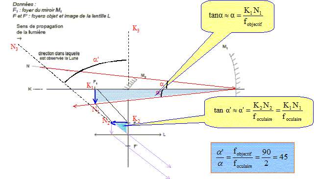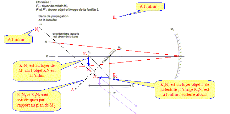 Sans souci d'échelle, compléter la figure en construisant l'image K1N1 de la Lune KN donnée par le miroir M1. Sans souci d'échelle, compléter la figure en plaçant l'image K2N2 de K1N1 donnée par le miroir M2. Clémentine a-t-elle correctement placé la lentille L dans son télescope pour qu'il soit effectivement afocal ? Sans souci d'échelle, compléter figure en construisant l'image définitive K3N3 de K2N2 qui sert d'objet pour la lentille L. A cause du phénomène de diffraction, l'image d'un point donnée par un instrument d'optique n'est pas un point mais une tache circulaire d'autant plus grande que le diamètre de l'objectif est petit. Si le grossissement de l'instrument est trop élevé, ces taches deviennent visibles et l'image est floue. Le grossissement maximal utilisable est égal à 2,5 fois le diamètre de l'objectif exprimé en mm. Clémentine mesure le diamètre de l'objectif et trouve 12 cm. Donnée : Grossissement d'un télescope G=a'/a ; a et a ' correspondent respectivement au diamètre apparent de la Lune et celui de son image définitive. Compléter la figure en plaçant les diamètres apparents a eta'. Démontrer que le grossissement du télescope G = fobjectif / f oculaire. Calculer la valeur numérique du grossissement du télescope de Clémentine. L'image définitive de la Lune observée par Clémentine est-elle nette ?