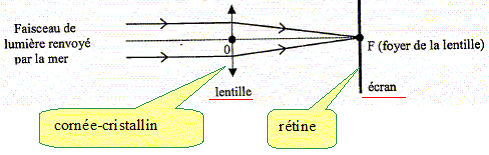 Dans quel cas deux couleurs sont-elles complémentaires l'une de l'autre ? Le mélange de deux couleurs dites " complémentaires" donne du blanc. Il est écrit dans le texte que l'eau liquide a une préférence pour le rouge. A partir de cette affirmation expliquer pourquoi la mer apparaît noire lorsqu"elle est éclairée par la lumière rouge d'un coucher de soleil ? La lumière émise par le soleil couchant contient essentiellement du rouge : le bleu-vert ont quasiment disparu. Or la mer absorbe la plus grande partie de la lumière rouge qu'elle reçoit : en conséquence elle ne diffuse pratiquement aucune lumière et paraît noire. Le trajet d'un faisceau de lumière renvoyé par la mer pénètre dans l'oeil selon le schéma suivant :