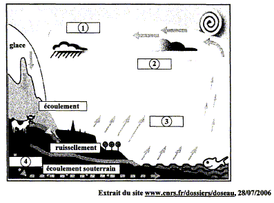 Identifier les trois états physiques de l'eau au cours de son cycle. liquide : écoulement souterrain, ruisselement. vapeur : évaporation ; solide : glace. Associer, à chacune des quatre étapes numérotés du cycle de l'eau, l'un des mots suivants : précipitation, infiltration, condensation, évaporation. (1) : précipitation ; (2) : condensation ; (3) : évaporation ; (4) : infiltration. Les eaux en bouteille. L'eau en bouteille se présente sous deux formes principales : l'eau de source et l'eau minérale, qui peuvent être vendues éventuellement sous forme gazeuse, naturelle ou pas. L'eau de source et l'eau minérale sont potables à l'état naturel et ont une même origine souterraine. Aucune ne subit de traitement chimique. L'eau minérale est tenue à une stabilité en sels minéraux et oligoéléments alors que l'eau de source ne subit pas ces contraintes [...], sa teneur en minéraux et oligoéléments est variable et non garantie. L'eau gazeuse est minérale ou de source. Elle est soit naturellement gazeuse et a, lorsqu'elle est en bouteille,la même teneur en gaz qu'à la source. Deuxième cas, elle est toujours naturellement gazeuse mais elle bénéficie d'un ajout de gaz provenant de la source. Troisième cas, l'eau a été renforcée avec du gaz autre que celui de la source, c'est à dire avec adjonction de gaz carbonique. Les étiquettes aposées sur les bouteilles mentionnent les composants et la teneur exacte de chacuns d'eux en milligrammes par litre, qui sont le reflet d'analyses fficielles régulièrement éffectués pour établir la typologie de l'eau. D'après le site : www.aci-multimédia.net/dossier/eau, 30/07/2005. Expliquer la principale différence entre une aeau de source et une eau minérale. "L'eau minérale est tenue à une stabilité en sels minéraux et oligoéléments" Quant à l'eau de source " sa teneur en minéraux et oligoéléments est variable et non garantie" Donner les trois moyens d'obtenir une eau gazeuse. " Elle est soit naturellement gazeuse" " elle est toujours naturellement gazeuse mais elle bénéficie d'un ajout de gaz provenant de la source" " 'eau a été renforcée avec du gaz ( carbonique ) autre que celui de la source"