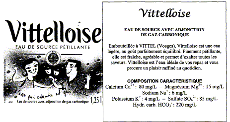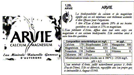 A l'aide des étiquettes, expliquer l'origine du gaz dans les deux eaux. Ces eaux renferment des bicarbonates ( ou hydrogénocarbonate HCO3-) en grande quantité. Donner le nom scientifique et la formule chimique du gaz contenu dans l'eau "Vittelloise". dioxyde de carbone CO2. L'eau minérale "Arvie" contiennent du calcium. A partir de l'étiquette, donner la quantité de calcium contenue dans 1 L d'eau d"Arvie". 170 mg/L. Déterminer la quantité de calcium nécessaire pour couvrir les besoins quotidiens d'une personne. 1 L d'eau d"Arvie apporte 20 % des besoins quotidiens en calcium d'une personne. D'où : 170*5 = 850 mg / jour. |