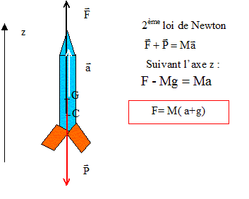 Le vecteur accélération est égale à la variation du vecteur vitesse divisée par la durée de cette variation. Ici tous les vecteurs sont colinéaires et de même sens ( la verticale ascendante) d'où : a =(v5-v4) / (t5-t4) = (25-14) / 2 ; a=5,5 m/s2. Valeur de la poussée.