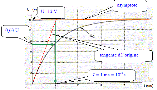 I. Charge du condensateur Le condensateur étant déchargé, on place à t = 0, l'interrupteur K en position 1. Un système d'acquisition permet d'enregistrer les graphes des tensions E et uC en fonction du temps. On obtient les courbes :