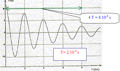 Pseudo-période voisine de la période propre du dipole LC T = 2p(LC)½. T2 = 4p2 LC ; L = T2 /( 4p2 C) avec C= 10-5 F. L= 4 10-6 / (4*10*10-5) =0,010 H. L'amortissement est la preuve que la bobine possède une résistance non nulle. A la date t = 2,0 ms , la tension aux bornes du condensateur passe par une valeur maximale voisine de 8 V ; l'intensité du courant est en conséquence nulle. Le condensateur stocke l'énergie du dipole (LC) sous forme d'énergie électrique. ½Cuc2 = 0,5 * 10-5 * 82 = 3,2 10-4 J. |
