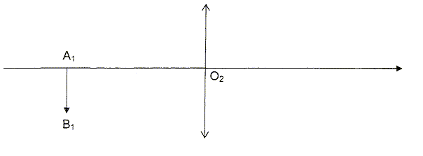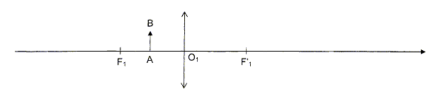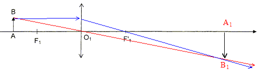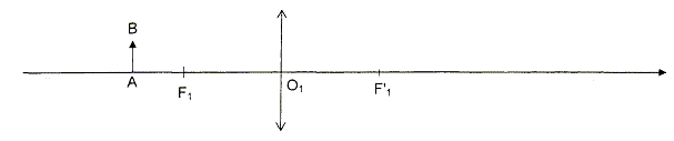L'objectif est un système optique convergent équivalent à une lentille mince convergente L1 de distance focale f'1. Il donne de l'objet AB posé sur la platine une image intermédiaire A1B1 renversée très agrandie. Compléter les figures ci-dessous en construisant l'image A1B1 de l'objet AB.
