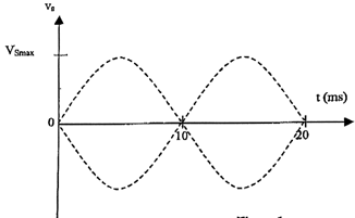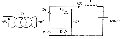 Le transformateur Tr est parfait. La tension v1(t) est sinusoïdale, de valeur efficace V1 = 230 V et de fréquence f = 50 Hz. La tension de sortie du transformateur v2(t) a pour valeur efficace V2 = 57,5 V. On suppose que le courant de sortie is(t) est ininterrompu.