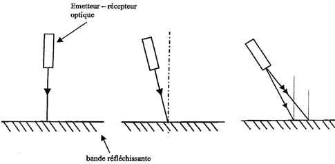 La figure ci-dessus représente le chemin d'un rayon lumineux incident lorsque l'axe optique du détecteur est normal au plan de la bande réfléchissante.