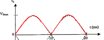 Rapport de transformation m du transformateur : m= V2 /V1 = 57,5/230 ; m = 0,25. Valeur maximale V2max de la tension v2(t) : La tension v2(t) est sinusoïdale de valeur maximale V2max = V2 * 1,414 = 57,5*1,414 V2max = 81,3 V. Rôle du pont de diodes : redressement double alternance. Alllure de la tension vs(t) délivrée à la sortie du pont redresseur : La valeur maximale de vs(t) est égale à V2max = 81,3 V, les diodes étant parfaites.