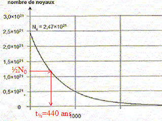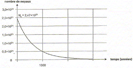 L'" américium 241 " fait partie des éléments contenus dans les déchets générés par une centrale nucléaire. Le graphique ci-dessous représente le nombre de noyaux d'un échantillon de 1,0 g d'" américium 241 ". L'équation de la courbe est donnée par : N = N0.e-l.t avec l = 5,110-11 S.I.