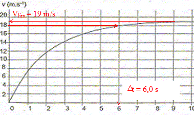 Equation différentielle qui régit l'évolution de la valeur v de la vitesse du grêlon : mdv/dt + kv = mg (1) Expression de la valeur v lim de la vitesse limite de chute : Lorsque la vitesse limite est atteinte, le mouvement devient rectiligne uniforme et dv/dt est nulle : (1) s'écrit : v lim = mg/k. Détermination graphique de la valeur v lim de sa vitesse limite de chute : la figure 1 donne vlim = 19 m/s. Valeur de k correspondant à cette vitesse limite dans le cadre de ce modèle : v lim = mg/k donne k = mg/vlim = 3,8 10-3 * 9,8 / 19 = 1,96 10-3 kg s-1 ( réponse : k = 2,0 10-3 kg s-1 ) Durée Dt au bout de laquelle la vitesse atteinte est égale à 95 % de la vitesse limite : 0,95*19 = 18 m/s