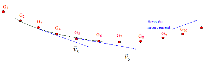 G2G3=1,6 cm ; G3G4=1,7 cm ; G4G5=1,8 cm ; G5G6= 1,8 cm. Valeurs v3 et v5 des vecteurs vitesses aux points G3 et G5 : v3 = (G2G3+G3G4)/ (2t) = (16+17)/ (2*30) = 33/60 = 0,55 m/s. v5 = (G4G5+G5G6)/ (2t)=(18+18)/ (2*30) = 36 /60 = 0,60 m/s. Représentation de ces vecteurs ( 1 cm <--> 0,1 m/s): Les vecteurs vitesses sont portés par la tangente la trajectoire au point considéré ; le sens est celui du mouvement.