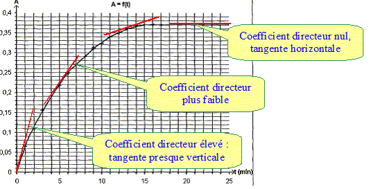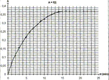 La vitesse est proportionnelle à dA/dt. dA/dt diminue au cours du temps ; la vitesse diminue au cours du temps. Interpréter cette évolution. La concentration des réactifs est un facteur cinétique ; au cours du temps la concentration des réactifs diminue et en conséquence la vitesse décroît. Expliquer pourquoi on peut considérer qu'au bout de 15 min , le système atteint son état final. La tangente à la courbe étant horizontale, la vitesse de la réaction est nulle. La composition du mélange ne change plus. L'état final est atteint.
