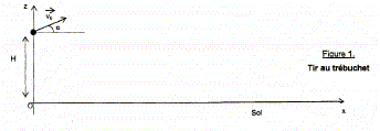 Le trébuchet est une machine de guerre utilisée au Moyen Age au cours des sièges de châteaux forts. Le projectile pouvait faire des brèches dans les murailles des châteaux forts situés à plus de 200 m du trébuchet. Son principe de fonctionnement est le suivant : Un contrepoids relié à un levier est maintenu à une certaine hauteur par des cordages. Il est brusquement libéré. Au cours de sa chute, il agit sur un levier au bout duquel se trouve une poche en cuir dans laquelle est placé le projectile. Lors de sa libération, le projectile de la poche se trouve à une hauteur H = 10 m et est projeté avec une vitesse faisant un angle a avec l'horizontale Les mouvements du contrepoids et du projectile s'effectuent dans un champ de pesanteur uniforme.