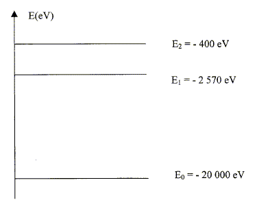 l = c / n ; n = c / l avec c : célérité ( m/s ) de l'onde ; l longueur d'onde (m) ; n : fréquence ( hz). De plus E= hn = hc/ l ; l = hc/E ; E s'exprime en joule. La plus petite longueur d'onde correspond à la plus grande valeure de l'énergie E. ( transition E2 ---> E0 ) E = 19 600 * 1,6 10-19 = 3,136 10-15 J. l = 6,62 10-34*3,00 108 / 3,136 10-15 ; l =6,3 10-11 m.