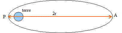 A l'aide des données ci-dessus, calculer la longueur r du demi-grand axe de la trajectoire sur cette orbite de transfert. 2 r = R+200 + R +36000 = 2R+36200 r = R+18100 = 6380+18100 = 2,448 104 km = 2,45 104 km. A l'aide de la troisième loi de Képler, en déduire la période T du satellite sur cette orbite de transfert. T²=K(R+h)3 = K r3 = 9,90 10-14 *(2,448 107)3 =1,32 109 T=(1,32 109)½ = 3,63 104 s.