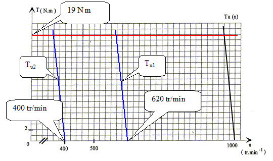 Fréquence de rotation n2 du moteur : Tracer la caractéristique utile Tu2(n) pour une fréquence de l'onduleur f2 = 20 Hz.
