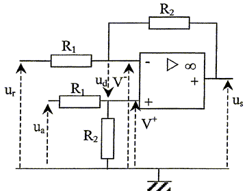 = ua/R1 ; écrire le théorème de Milleman en V- : V- [1/R1 + 1/R2]= us/R2+ur/R1. Réduire au même dénominateur R1R2 :V+ [R1 +R2] = R1us+R2ur. V-=(R2ur +R1us) / (R1+R2)